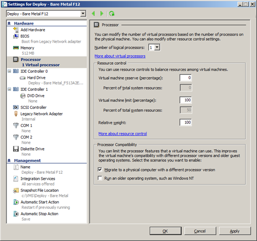 3. When upgrading from Hyper-V RTM to Hyper-V R2 you need to turn of all running machines and you need to remove all snapshots. BEFORE you start them up please modify the following: