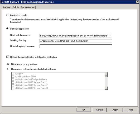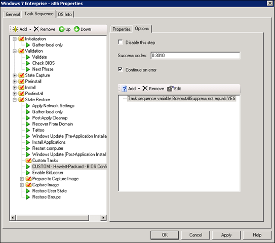 In the first picture you can see that I have added the application called “CUSTOM – Hewlett-Packard – BIOS Configuration” and in the other picture you can see that I have one condition to run this and that is same condition as the task “Enable Bitlocker” has.