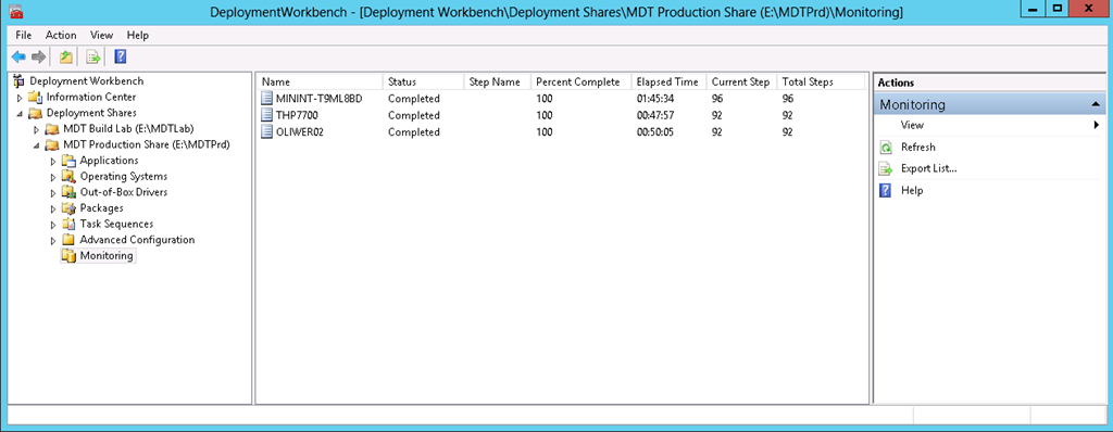MDT 2012 gives you monitor capabilities and that is very convenient. The basic configuration is that you enable that which will then install a service and then you can use the monitor tab to see and follow the flow of installs. Here is my configuration, I’m using the default ports 9800 and 9801 and the server name is SRVMDT02.