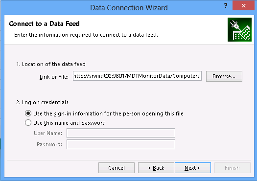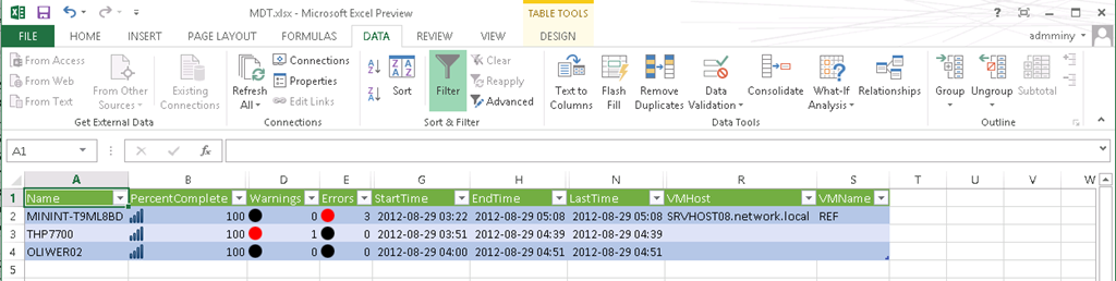 But it is possible to consume the data using any method and one easy way which I have started to do is to use Excel 2013. In Excel 2013 it is possible to read OData and that is the format that MDT 2012 is providing. The benefit is that you can create more colorful diagrams, easier to have massive amount of machines, sort, bend, twist and all that.