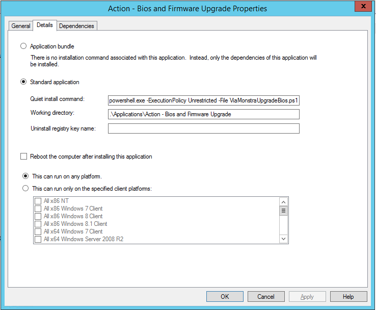 The basic Idea is to have a PowerShell script run that will discover what bios version we have and IF we have an update run the update according the that model’s specific way of running a firmware upgrade. It is also possible to just use the PowerShell script as a framework for other similar task of course, or you could use it to kick off something like SSM(HP) to do the job. I did one change, besides using PowerShell and that is to copy down the files to the local drive before running the upgrade, just to be sure that a messy network does not break the upgrade. The script is tested with a couple of HP’s, a Dell and a Lenovo, so there is of course no way I can guarantee it will work with every piece of PC around the globe, but hey, its PowerShell so you can modify it on your own :-). I also created it as an application for MDT LiteTouch, so you need to modify it slightly to run it in SCCM and it also needs the “AliasUserExit.vbs” script since I’m using ModelAlias and MakeAlias. If you don’t like that, just change the lines in he PowerShell code to use Make and Model or anything else that you can read from WMI using PowerShell