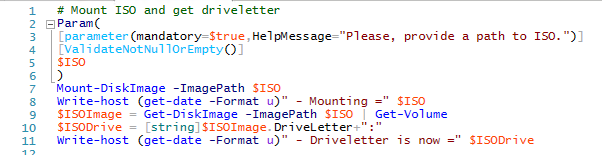 I actually have to scripts in this case, one is to mount the ISO that will return the drive letter, kind of handy to have since I need to know the path to the wim file