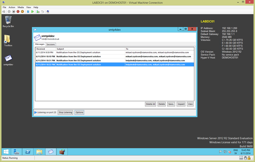 In the field, at hotel rooms, in VM environments, Demo setups and many other situations your are in the situation that something needs to be able to send an email and installing an Exchange Server at that time might be very wrong. So I have been using a really nice SMTP server that basically accepts anything, with any kind of settings and that has the ability to present all these mails in a single view. Extremely “handy” to have. Download it from http://smtp4dev.codeplex.com/