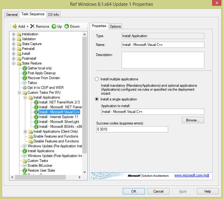 I had a problem with Server 2012 R2 and the 2015 VC++ installer. It was restarting the computer during the Task Sequence which would result in a Dirty Deployment warning. I was able to resolve this by editing the WSF script and adding a “/norestart” switch to the VC++ installers.