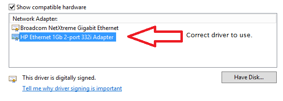 Download the HP Ethernet 1 GB 2-port 332i Adapter driver from HP and install that instead, the 45 minutes is now just 5 minutes…