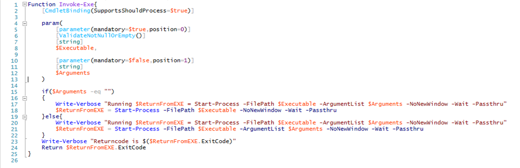 During today’s Management Masters I did a demo on how and why to use application wrappers, in one of the demos I showed a function called Invoke-Exe and I thought I did publish that long time ago, but I did not, so here it is. Actually, there is two versions of this. One that always return the exit code from the app and then you can use that for conditioning, the other one checks that the return code is what you told it to be and if not it throws an error.