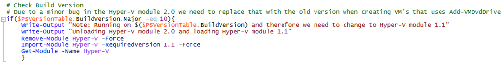 | Write-Output "Note: Running on $($PSVersionTable.BuildVersion) and therefore we need to change to Hyper-V module 1.1" | |