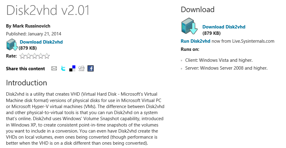 - Download and run disk2vhd, save the VHDx file on a file share or disk