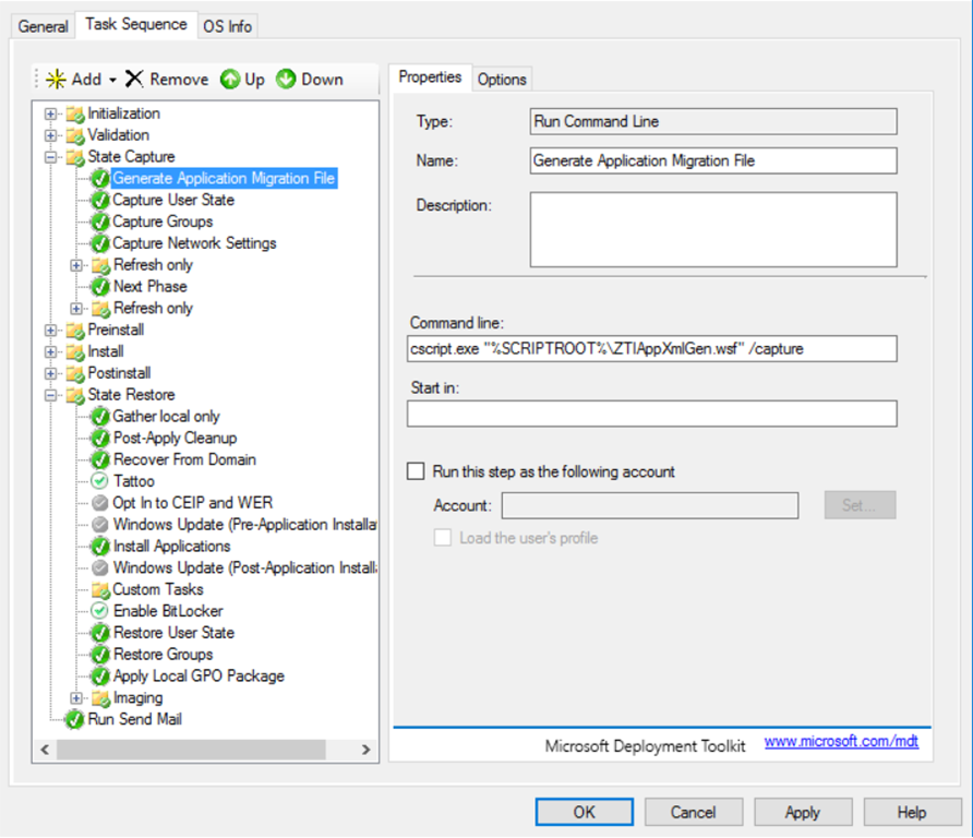 Today during class we worked on Refresh and Replace scenarios. We touched based on a tiny step in the Task Sequence that is actually really cool. In the Task Sequence for Lite Touch (MDT Standalone) there is one step that does not exist in Zero Touch and that is the “Generate Application Migration File” step.