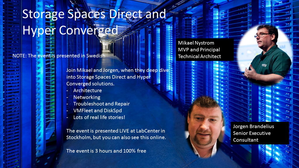 Jag och Jörgen kör ett kvälls event på LabCenter den 12:e april, då bjuder vi på lite tilltugg och 3 timmar med Storage Spaces Direct och Hyper Converged. Vi har gjort en dröse sådana installationer och vill gärna dela med oss av dom roliga delarna såväl som dom tråkiga.