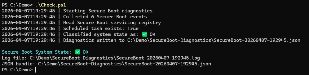 Check task healthGet-ScheduledTask -TaskPath '\Microsoft\Windows\PI\' -TaskName 'Secure-Boot-Update' | Select-Object TaskName, State, Enabled
