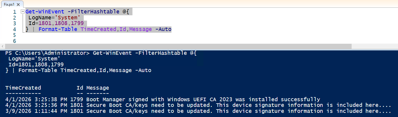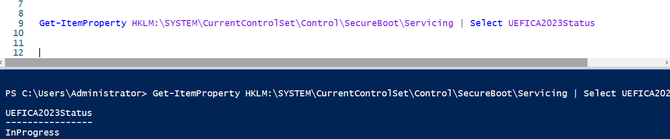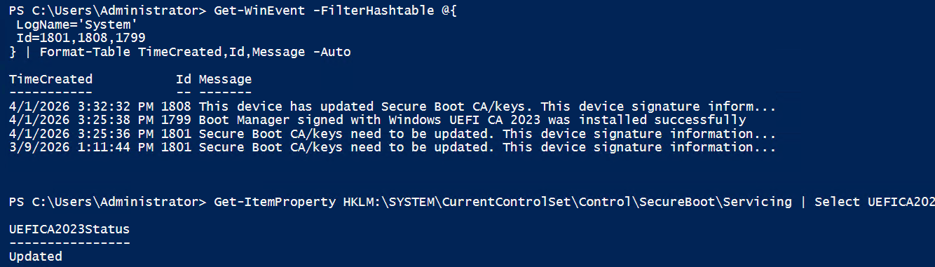 Check servicing statusGet-ItemProperty HKLM:\SYSTEM\CurrentControlSet\Control\SecureBoot\Servicing | Select-Object UEFICA2023Status, UEFICA2023Error, UEFICA2023ErrorEvent