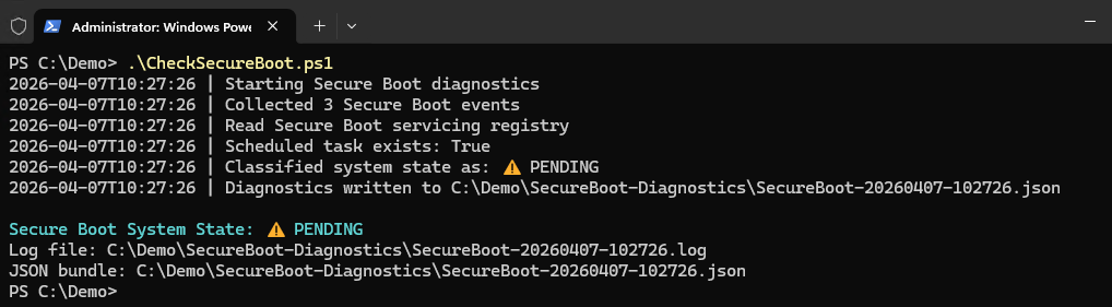 Check task healthGet-ScheduledTask -TaskPath '\Microsoft\Windows\PI\' -TaskName 'Secure-Boot-Update' | Select-Object TaskName, State, Enabled